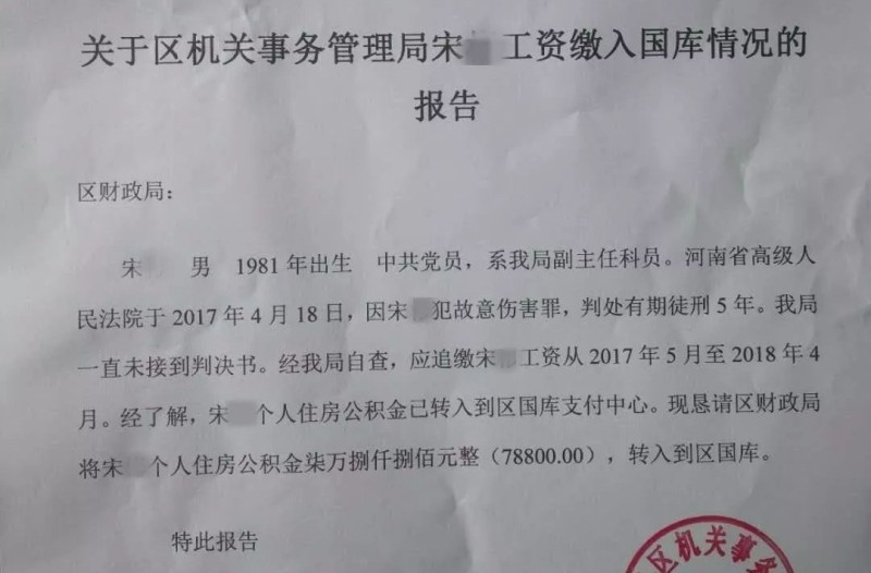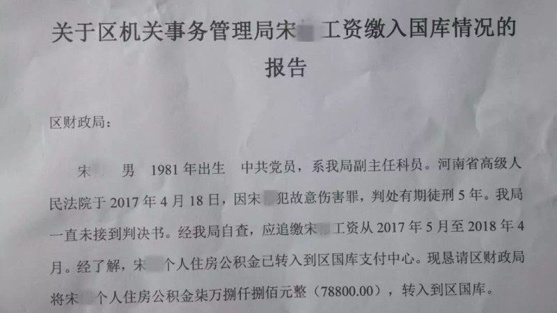 目前,河南省开封市新区机关事务管理局已向该区财政局发函,要求收缴宋某服刑期间发放的工资及住房公积金。