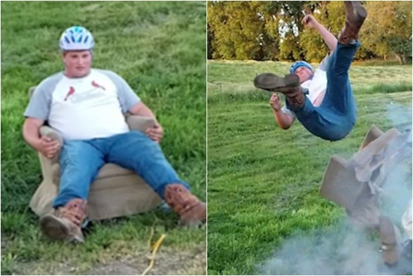 他还在气囊上加了一个米黄色的旧扶椅,一切都显得那么简陋。一切就绪,摄像师倒数3,2,1,安全气囊立即展开,该男子被弹射到大约5英尺(约1.5米)高的空中。随后,他身体坠落,重重的摔在草坪上。男子惊魂未定的爬起来,一脸严肃,全程面无表情。