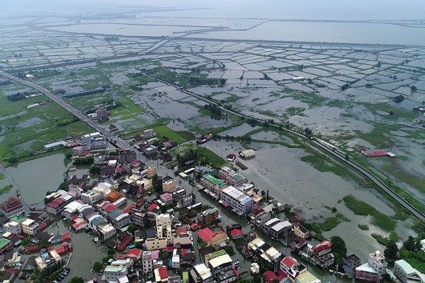 嘉义县东石乡栗子崙地区淹水未消退。(嘉义县政府提供/中央社)