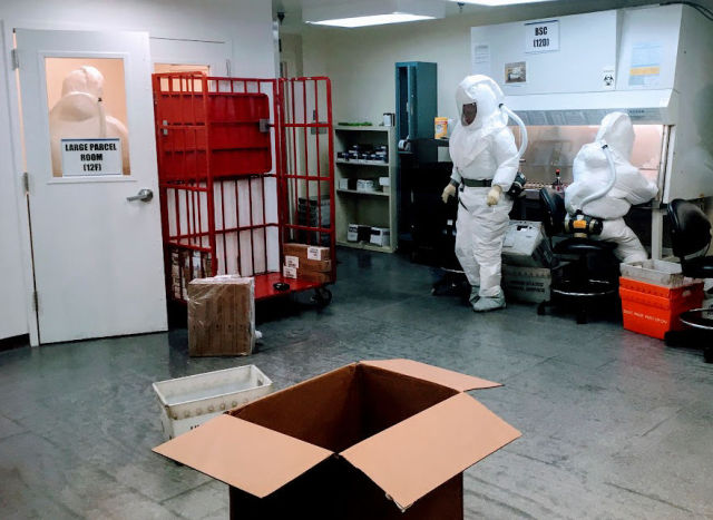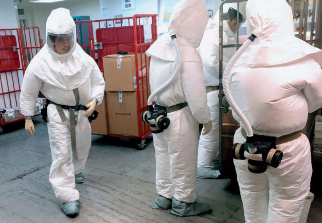 2018年10月2日,美国国防部人员穿着防护服在华盛顿特区五角大楼附近的一个设施,检验邮件接收处。(THOMAS WATKINS/AFP/Getty Images)