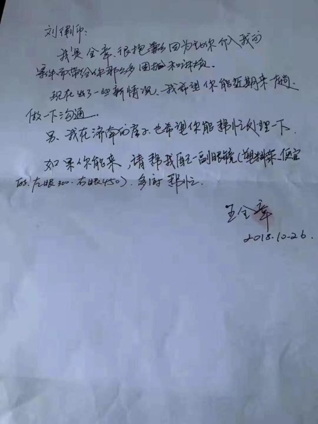2018年10月31日,刘卫国律师发布王全璋写给他的一封信。(社交媒体)