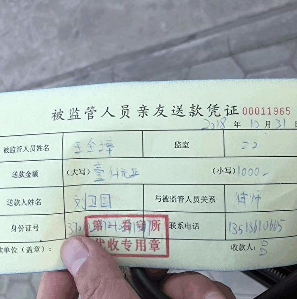 律师刘卫国在上周表示,因健康原因退出代理王全璋案。不过,10月31号,刘卫国在社交媒体展示并声称,王全璋写给他亲笔信。信中说,现在出现了一些新情况,“希望你能近期来一趟做一下沟通”。与信件一起发布的一张第一看守所的“被监管人员亲友送款凭证”显示,刘卫国当天以律师的身份,为王全璋存进了1000元(人民币)现金。