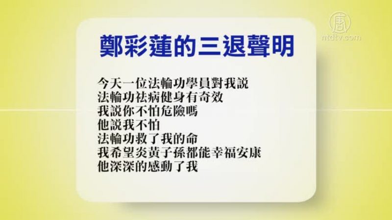 【新!唐!人:2019年01月04日讯】佳木斯一名民众说,听到法轮功学员讲真相,突然明白了一个道理,因此郑重声明退出中共组织。她在退!党!声明中讲了这段经历,一起来看一看。