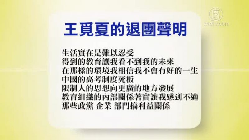 王觅夏声明退*团-说:生活实在是难以忍受,得到的教育让我看不到我的未来,在那样的环境我相信我不会有好的一生。中国的高考制度死板,限制人的思想向更广的地方发展,教育组织的内部关系着实让我感到不适,那些政党、企业、部门搞利益关系,一切看来都是他们的表面功夫!这样的组织是人类文明停滞的必然因素。因此我是不会助纣为虐的。中共!请停止你们的罪行。