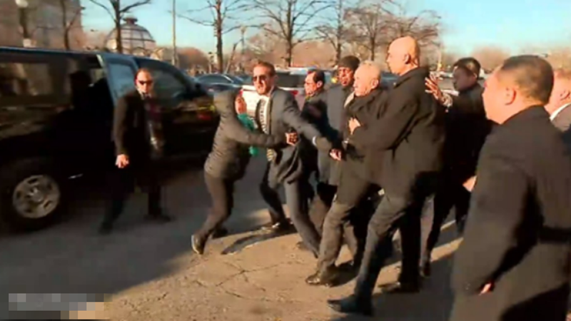 “当时所有的访民都往上冲,有美国的也有中国的安保人员。王春艳当时有一个空档,她就从下面抱住了刘鹤的大腿,我当时就绕到车行道上,直接冲到他面前。我们就给他递材料,他没有收。后来他的安保人员就把我推到一边去了。我们访民还是抗争,还是往上冲,结果安保人员把我一下子推到马路上,脑袋磕在车上,反正我坐在地上了,磕倒了。”