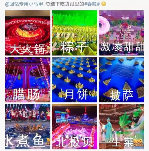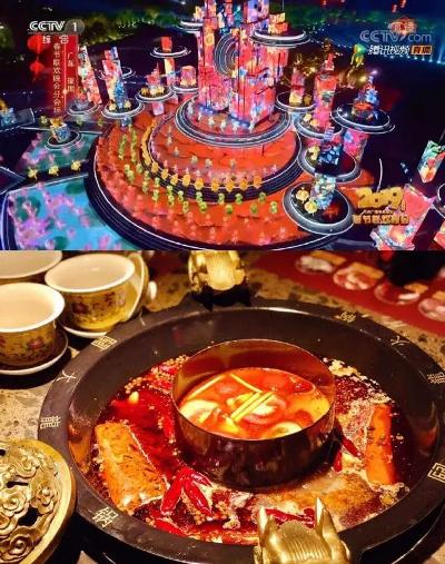 有网友发帖图文并茂的吐槽说,“这一届春晚的舞美,对吃货们是极大的诱惑。”该网友贴出的对春晚舞台场面与火锅、菜肴的对比图的确十分相似,让众多网友看后笑翻。