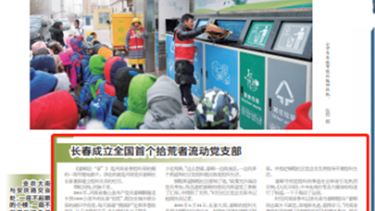 3月5日,中共人大会议开幕,当天《长春日报》刊登一篇题为“长春成立全国首个拾荒者流动党支部”的报导。报导称,河南省鲁山县来长收废品的姜顺和一些捡破烂人员,共同成立了党支部,现已拥有115名流动党员、下设6个党支部、覆盖数万流动人口。