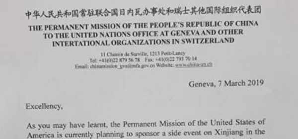 人权观察取得了一封中共致日内瓦各国使团的信函。中共在信中威胁各国使团,“为了我们的双边关系和持续的多边合作”,各国不应该“合办、参与或出席”3月13日举行的一个有关新疆问题的人权讨论会。