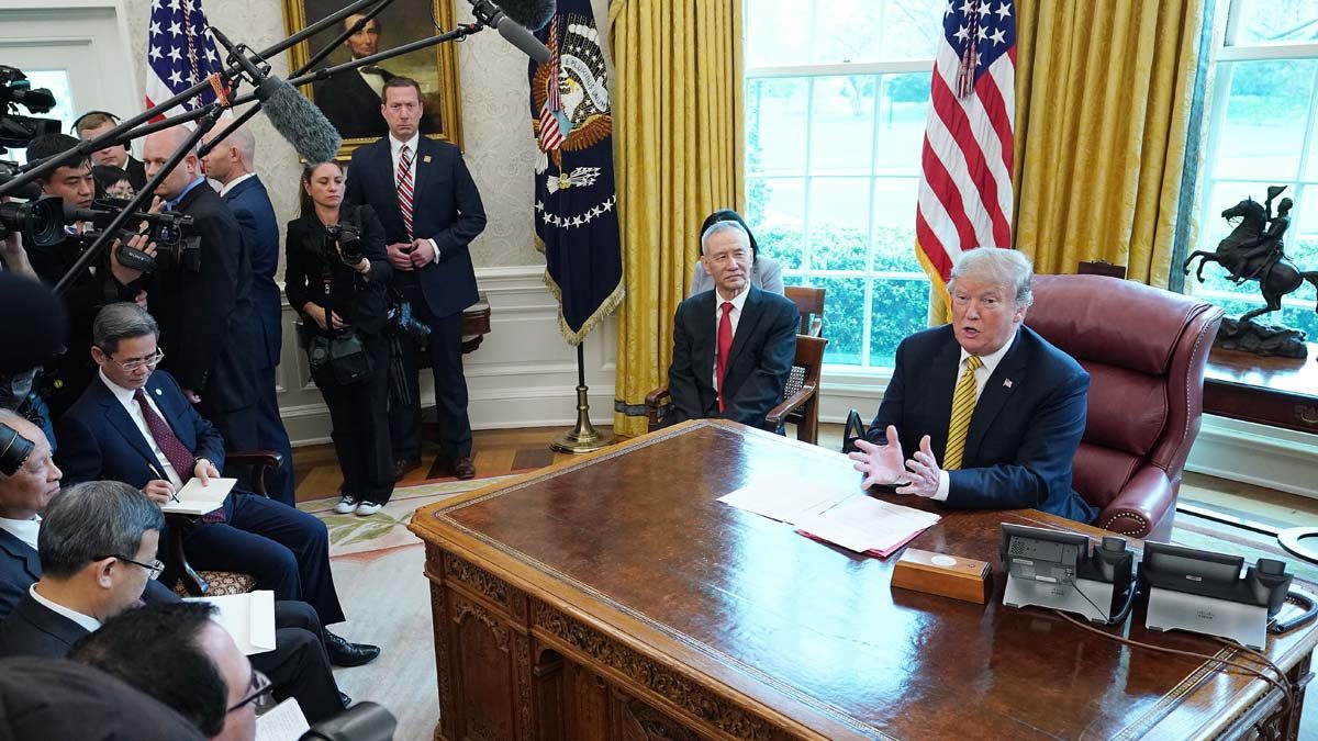 【新!唐!人:北京时间2019年04月05日讯】川普(特朗普)前两次在白宫会见中共副总理刘鹤时,安排刘和白宫官员坐在一起,被指向川普“汇报工作”。本周川普再次接见刘,让他坐在自己身边。中共外宣据此炒作谈判前景乐观。不过,谈判还剩两个关键问题未解,最终能否成功仍是未知数。