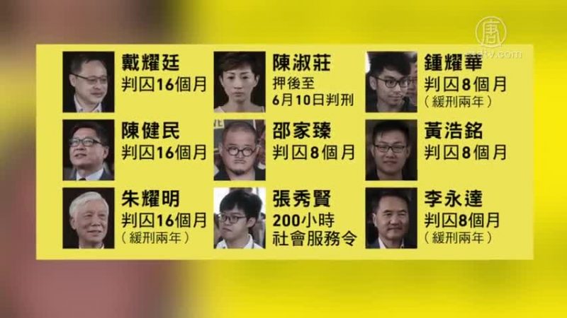 香港和平占中发起人戴耀廷、陈健民、朱耀明等9名人士,4月24号被香港区域法院法官陈仲衡判刑,戴耀廷、陈健民、邵家臻、黄浩铭4人被判实时入狱8至16个月,另有4人分别被判缓刑和社会服务,立法会议员陈淑庄,则因为发现患脑瘤需要及时动手术,延后至6月中旬判刑。