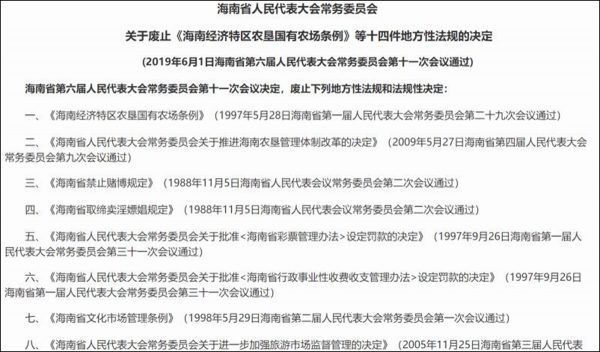 中共官媒报导说,被废止的法规和决定中,包括1998年通过的《海南省禁止赌博规定》、《海南省取缔卖淫嫖娼规定》,《海南省人民代表大会常务委员会关于批准〈海南省彩票管理办法〉设定罚款的决定》等等。