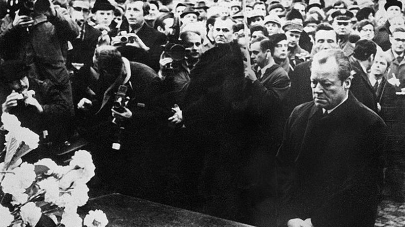 他向纪念碑献上花圈后,肃穆垂首,突然双腿下跪,并发出祈祷:“上帝饶恕我们吧,愿苦难的灵魂得到安宁。”勃兰特以此举向二战中无辜被纳粹党杀害的犹太人表示沉痛哀悼,并虔诚地为纳粹时代的德国认罪、赎罪。