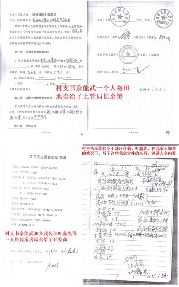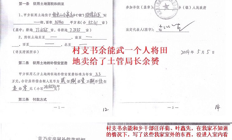 我家所有口粮田和住宅下的土地,都被村支书余能武一个人在我们都不知情的情况下,将所有土地全部卖给了商城县土地管理局局长余赟。村支书余能武还和乡干部汪洋菊、叶先鑫在我家人不知道的情况下,写了我家室外的一些建筑就算是登记丈量了。村支书余能武在我家都不知情的情况下,将我家房屋卖了出去。总之,我们的一切材产得命运都掌握在官办的村支书手里,我们真的不如过去《白毛女》中的杨白劳,你看看我们所有抢劫去的房屋和田地证据中没有我们签一个字,一个手印都没有。