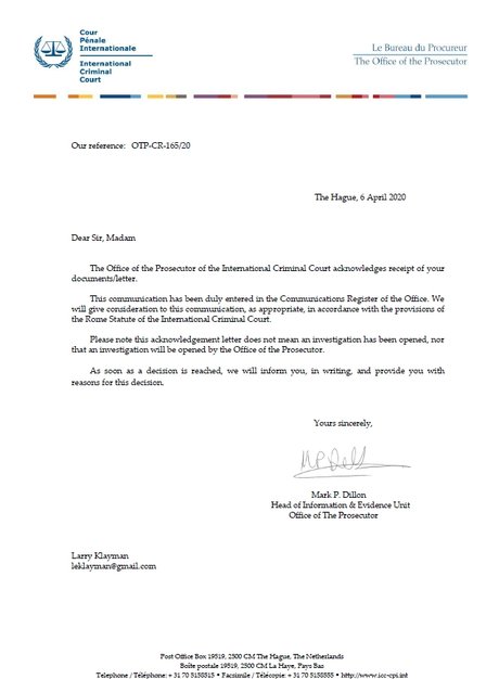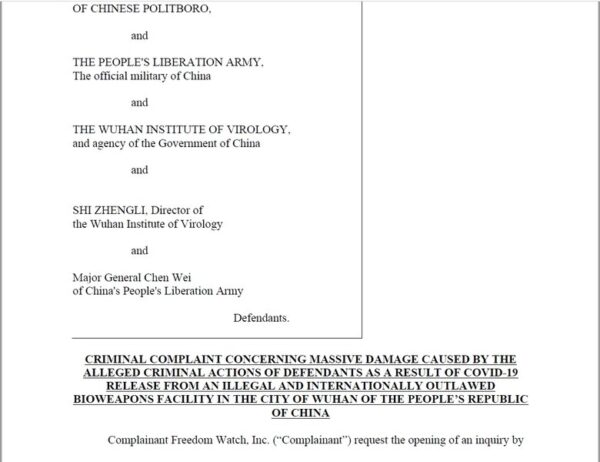 克莱曼(Larry Klayman)出示ICC的通知书,以及诉状文本,上面列名的被告,包括中共政府、中国共产党中央政治局、中共军队、首席生化武器专家少将陈薇、武汉病毒研究所及主任石正丽等。他3月18日向德州的联邦法院,提起民事集体诉讼,向中共当局与共军,求偿20兆美元。他表示,正联系世界各地律师,在多国控告中共,也正募集更多人参与集体诉讼。
