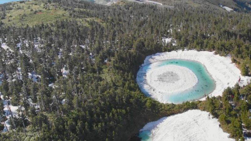 【新!唐!人:北京时间2020年06月13日讯】日本横跨岩手县与秋田县之间的八幡平山顶镜沼,本周一(8日)出现春雪融化后的“龙之眼”自然奇景。