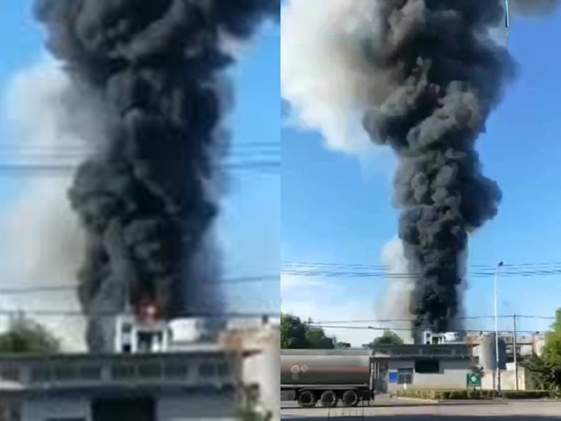 多段视频显示,8月3日傍晚6时许,化工厂一车间内及周围,熊熊大火正在燃烧,滚滚黑烟形成“蘑菇云”直冲云霄。爆炸发生时,工厂正在生产。