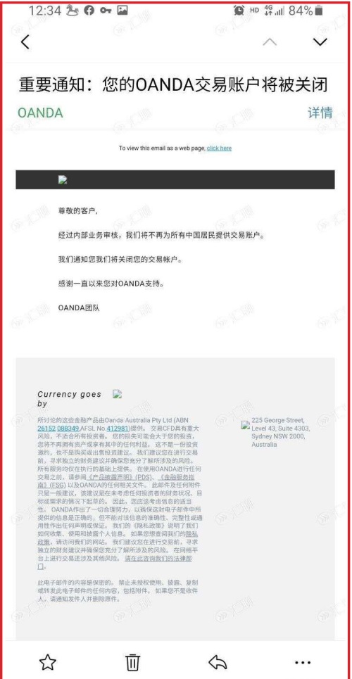 美国外汇经纪商OANDA安达近期向其客户发出通知指出,将于今年10月30日下午两点(北京时间次日凌晨3点),关闭所有中国大陆客户的交易账户。官方通知如下:“尊敬的客户,经过内部业务审核,我们将不再为所有中国居民提供交易账户。我们通知您我们将关闭您的交易账户。感谢一直以来您对OANDA支持。”