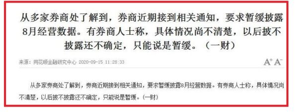 另据《 第一财经》网站本周二(15日)披露,按照惯例,证券公司在每月10号前会披露上一个月的经营数据简报。但目前已进入9月中旬,全部上市券商的8月月报却都迟迟未至。第一财经获悉,券商于近期接到相关通知,要求暂缓披露8月经营数据。有中小型券商投资者关系部人士称,于上周接到相关通知要求暂不披露8月经营数据。至于10月份会不会发9月的经营简报,仍要等待通知。