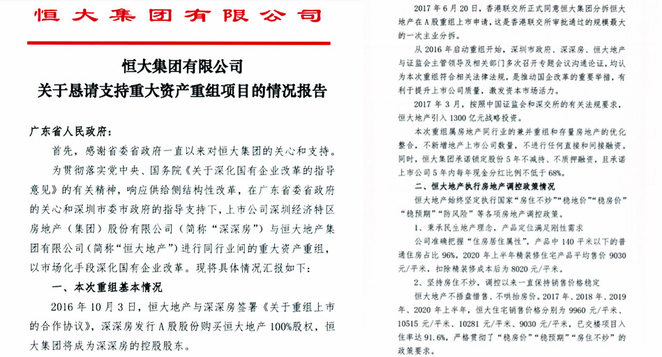 在恒大辟谣之前,网络热传一份中国恒大集团写给中共广东省政府一份《恒大集团有限公司关于恳请支持重大资产重组项目的情况报告》。