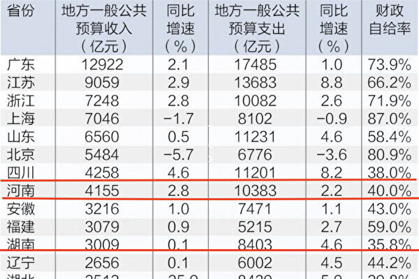 根据中共官方统计数据,除了上海、北京、广东、浙江之外,其余省市财政自给率均低于七成,其中有四个省份的赤字超过5000亿元(人民币,下同),排名第一的四川一年间赤字数额直逼7000亿元。