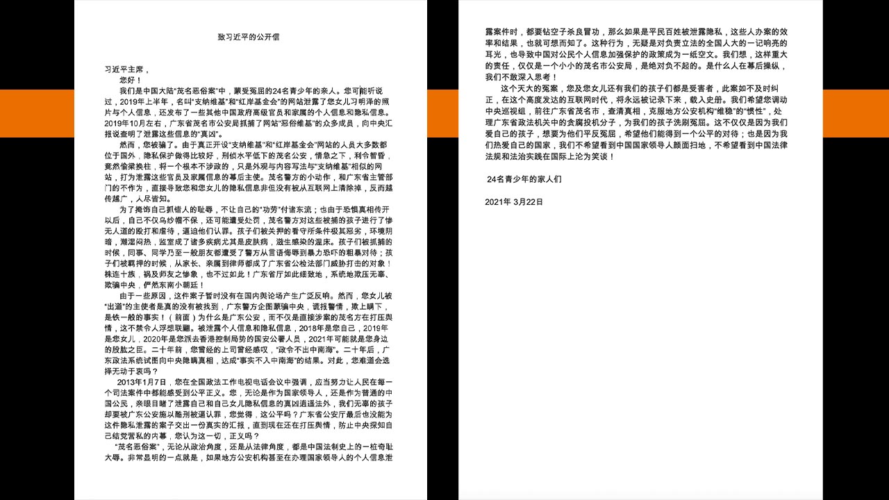 3月22日,24位获刑年轻人的家长,联合给习*近*平写公开信,告诉习*近*平,习被地方官员欺骗,导致习及家人的信息不但没有被清除,反而流传的愈加广泛。