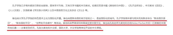 该网站强调了维也纳大学孔院在奥地利和联合国所起到的作用,指出“维也纳是联合国的官方驻地之一,是座国际化的城市。孔子学院每年都与相关机构联合举办‘联合国汉语日’、‘联合国和平日’、‘世界和平合唱节’等活动”;“孔院为奥地利外交部、国防大学、外交学院等单位”开设了中文课程。