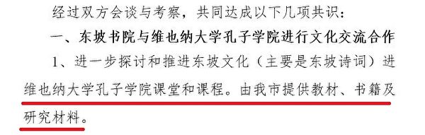 值得一提的是,维也纳大学孔子学院与中共儋州市政府当时达成的第一项“共识”,是由儋州市政府向维也纳大学孔院提供东坡文化的“教材、书籍及研究材料”。