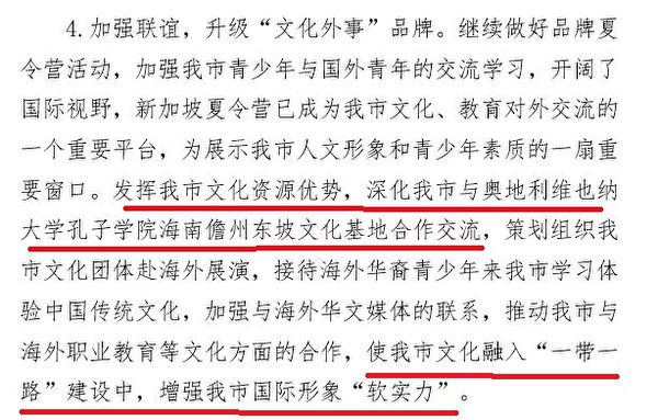 该文件披露,“发挥我市文化资源优势,深化我市与奥地利维也纳大学孔子学院海南儋州东坡文化基地合作交流”,从而“使我市文化融入‘一带一路’建设中,增强我市国际形象‘软实力’”。