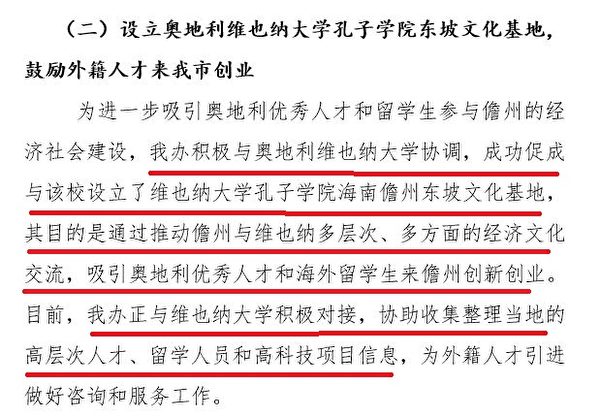 市外事办在文件中汇报说“我办积极与奥地利维也纳大学协调,成功促成与该校设立了维也纳大学孔子学院海南儋州东坡文化基地”,“其目的是通过推动儋州与维也纳多层次、多方面的经济文化交流,吸引奥地利优秀人才和海外留学生来儋州创新创业。”