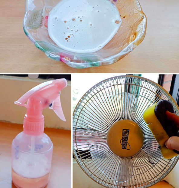接下来清洁风扇罩,可取一块海绵菜瓜布,在海绵的那一面用小刀割成九宫格或十二宫格的形状,再以海绵沾取清洁液,轻刷外罩,便可轻松除去风扇罩上的灰尘。