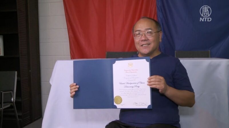 民运人士郑存柱:“她在信里面讲的是,非常感谢我们对香港的帮助,她知道我们这样的一个努力是不会忘记的,支持了一些为民主自由奋斗的人士,应该的,国会通过这位议员,颁布了这样一个褒奖证书给中国民主党。”