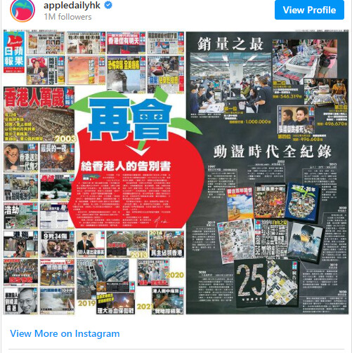 最后一份报纸其社论以“给香港人的告别书”为标题,指“苹果死亡,新闻自由是暴政的牺牲品”。