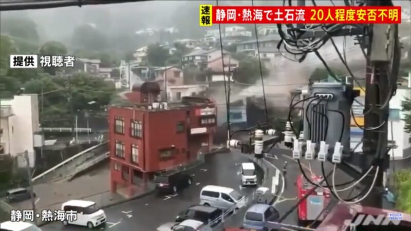 【新!唐!人:北京时间2021年07月03日讯】日本部分地区受锋面滞留影响降下大雨,神奈川县箱根町及静冈县御殿场市48小时累积雨量,已超过往年7月全月平均雨量。静冈县热海市伊豆山区3日更因大雨发生大规模土石流,大约有20人居住的民宅遭到波及,当局已成立灾害对策本部,并请求自卫队协助救灾。