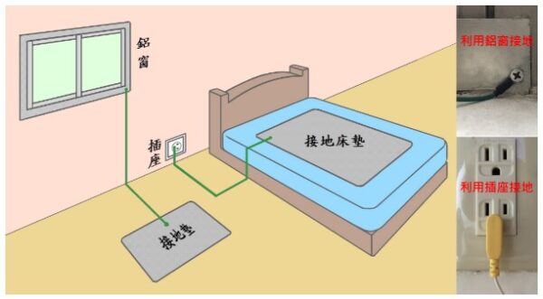 2. 间接接地:使用接地装置,将接地专用的贴片、地垫、床垫、枕头套等,透过接地线连接到大地。这类装置非常便利,无论站立、坐卧皆可轻松接地。另外,也可以买接地鞋来穿。