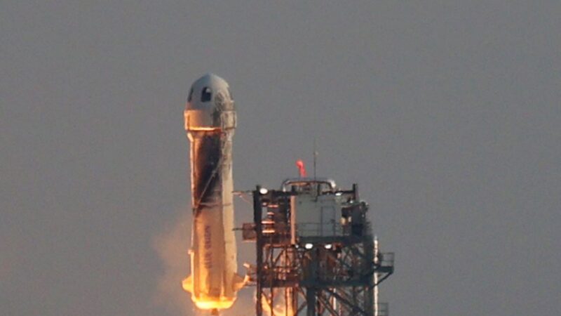 蓝色起源的新谢泼德号火箭助推器点燃引擎,加速离开发射台,进入德克萨斯州的天空。如果一切按计划进行,机组人员应在几分钟内进入太空。