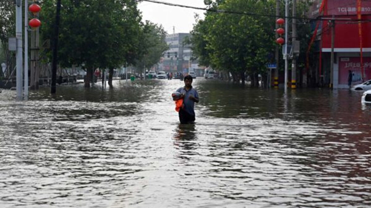 7月23日,新乡市卫河两岸可见大面积村庄、社区、农田、道路被洪水淹没,水深处达两米以上。而在新乡市凤泉区下辖村庄可见,大量房屋被洪水淹没,水深处一层建筑几乎没顶。