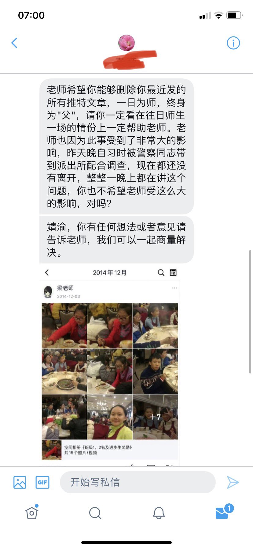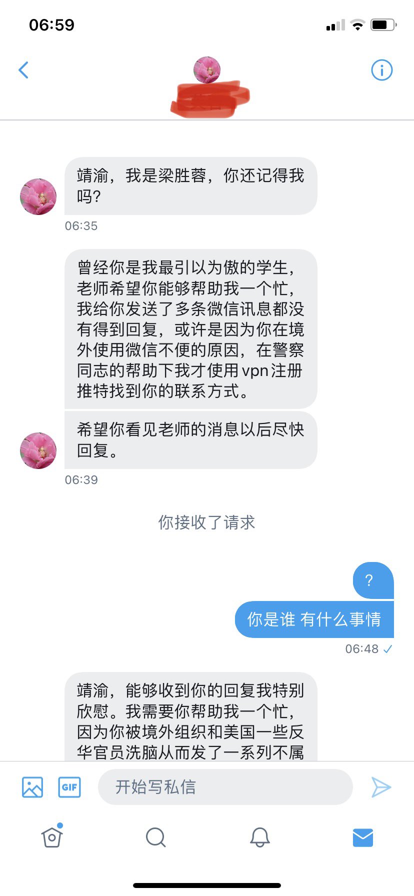 她在私信中说,自己因为王靖渝受到牵连,希望他念在往日的情分,删除他“被反华势力洗脑而发布”一系列推特文章。
