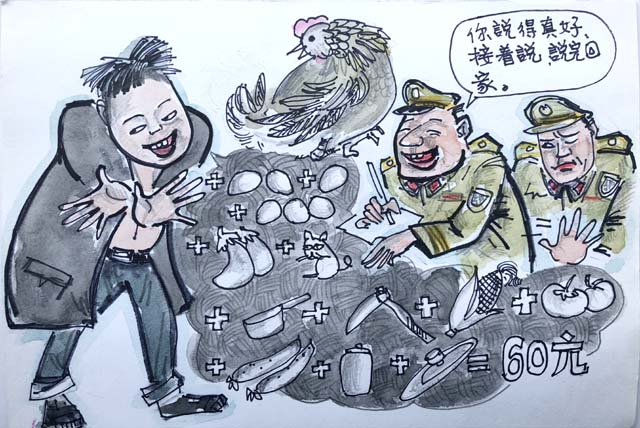 今天为大家展示的是大成先生的一幅作品《乱世用重典》。画面上有一个看上去不太正常的人,正在信口开河地讲着什么。他对面有两个警察,一个正在满脸笑容地做着笔录,对那个人说,“你说得真好,接着说,说完回家”。但另一个警察一边摆手、一边使眼色,示意那个人不要再讲了。