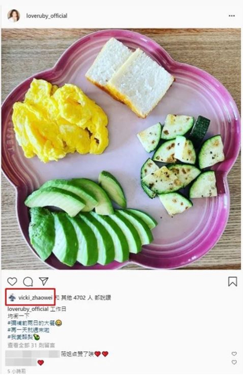 10月7日,林心如在海外社交媒体IG晒出自己工作日的餐盘,粉色的花型盘子上只有清淡的酪梨、栉瓜、炒蛋以及小片的面包。