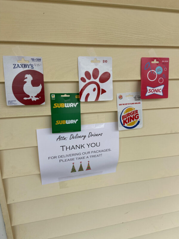 居住在纳什维尔郊外的克里斯汀‧朗(Christine Long)将来自各种商家的礼品卡贴在门廊上的门铃处,位置与视线齐平,礼品卡下方还附了一张纸条,上面写着:“收件人:送货司机。感谢您一直帮我们递送包裹,请您随意挑选一个!”