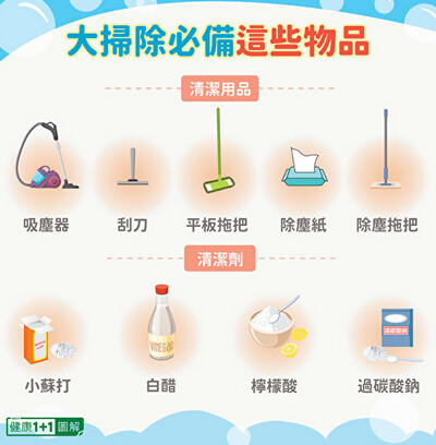 巧妙利用工具,可让打扫更省事。陈安祺举例,平板拖把就是很好用的工具,清洁的面积大,还能减少爬上爬下的概率。因为平板拖把上的布可以替换,可同时准备几块布,用来清洁不同的地方,例如厨房墙壁、厕所墙壁、玻璃门窗等。
