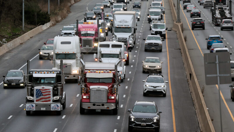 这些贴着标语或悬挂国旗的大卡车在没有堵塞交通的情况下,环绕华府两圈,向拜登政府表达争取自由的诉求,要求政府取消疫苗令等强制防疫手段。