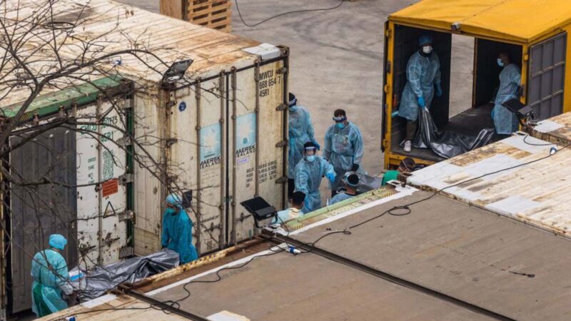 随着疫情越来越严重,医院中每天越来越多的死者的遗体需要运送去殓房。由于殓房停尸位不够,他也曾经只能把遗体搬运到尚在装修的病室里去。