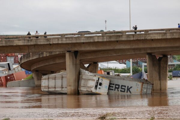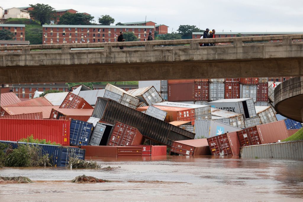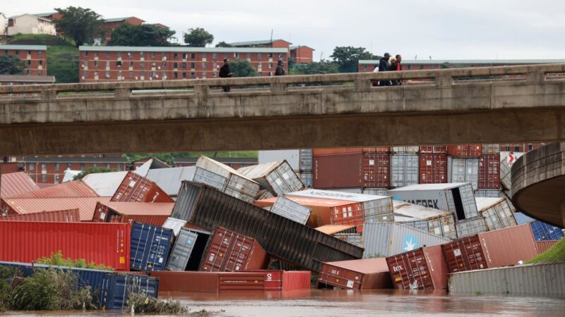 德班港被洪水淹没,集装箱被冲得乱七八糟,居民家园被洪水冲走,建筑物倒塌,道路基础设施严重受损。