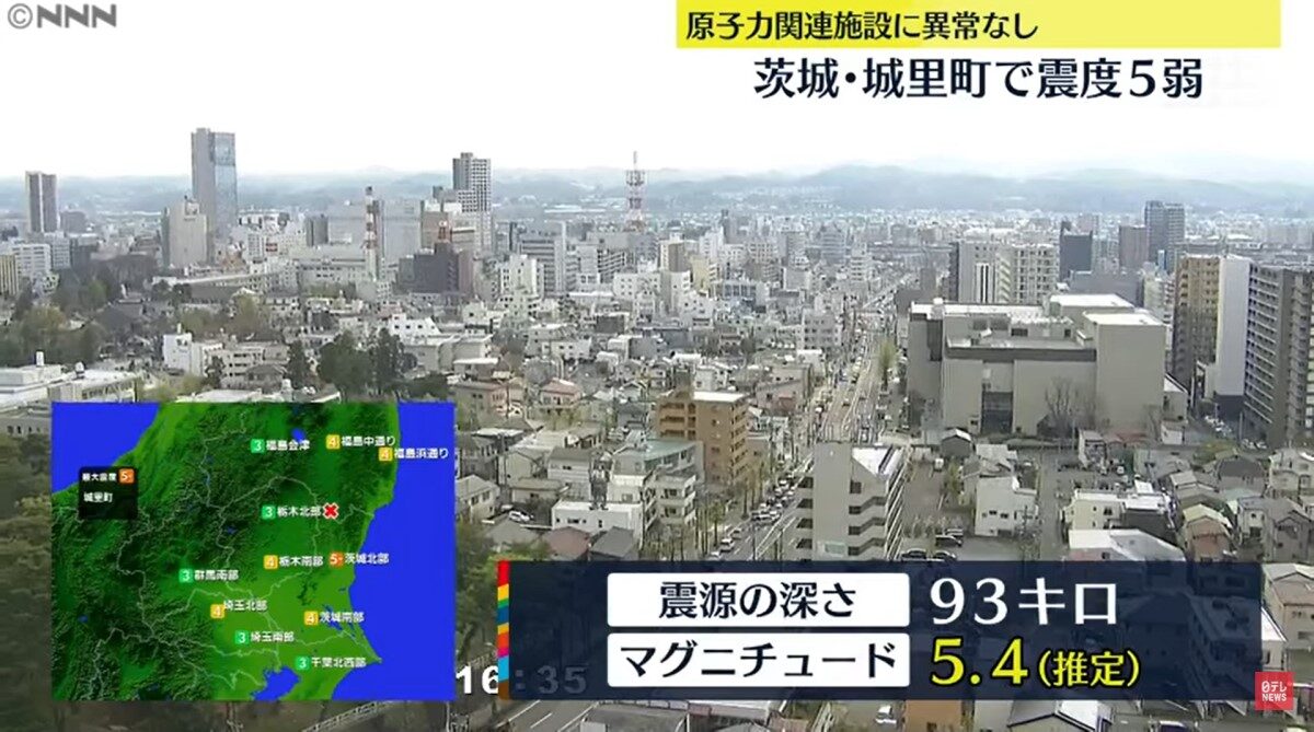 【新!唐!人:北京时间2022年04月19日讯】日本福岛县中通地区今天(19日)上午8时16分左右(当地时间)发生规模5.4地震,深度93公里,茨城县观测到最大震度5弱,无海啸风险,目前尚未有灾情传出。