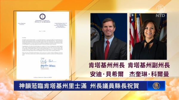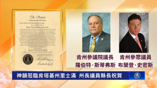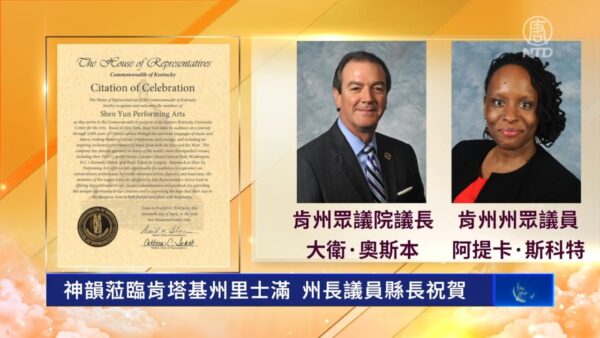 肯塔基州众议院议长大卫·奥斯本和州众议员阿提卡·斯科特连署了该州众议院对神韵的嘉奖令。嘉奖令中说:“总部位于纽约州的神韵艺术家们通过舞蹈和中西方乐器联璧演奏的音乐,引领观众领略中国五千年的传统文化,从而唤起他们心中的美德、善良和勇气。”