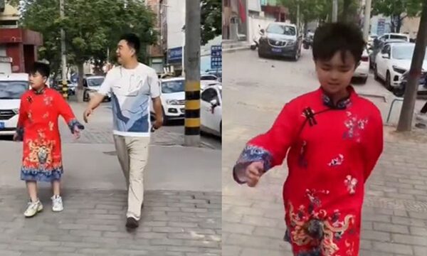 当天,儿子穿着大红色的旗袍,和爸爸一起走在路上,回头率超高。(点击观看视频)