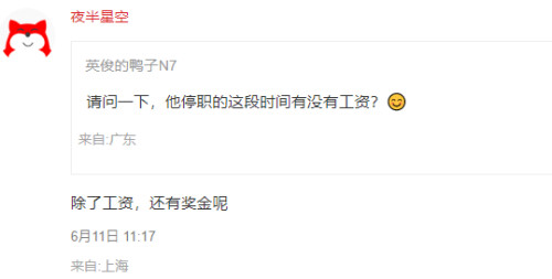 对此,网名为“英俊的鸭子N71”的网友留言问,“他停职的这段时间有没有工资?” 上海网友“夜半星空”回复说:“除了工资,还有奖金呢。” 网友Buck-sh则跟帖感叹,“ 能吃羊肉的都不是一般人”。