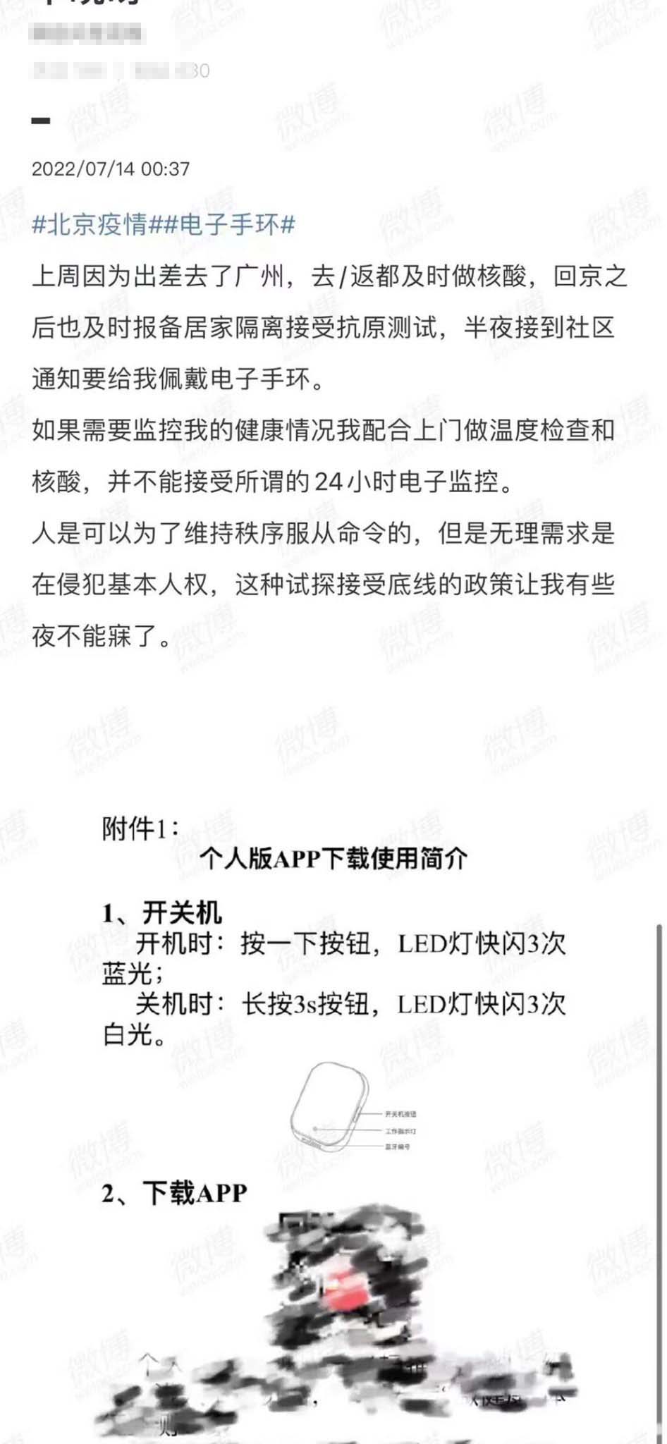 7月13日和14日,多名北京市民陆续在网上控诉被强制佩戴电子手环。这些网民称,自己从外地返京后,按当局要求居家隔离,然后就接到政策更新的通知,要求居家隔离者必须佩戴一款白色的电子手环。
