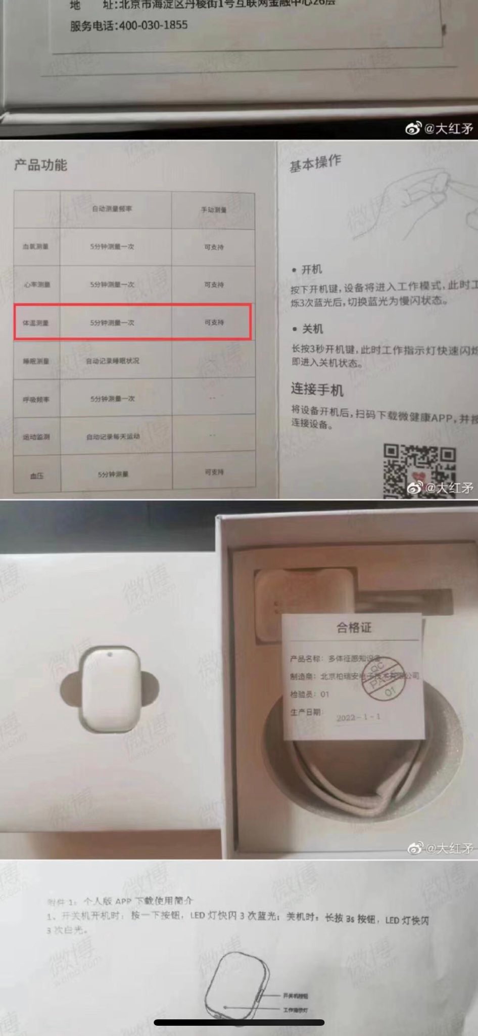 这款手环名为“多体征感知设备”,功能包括体温测量、心率监测、运动监测等。